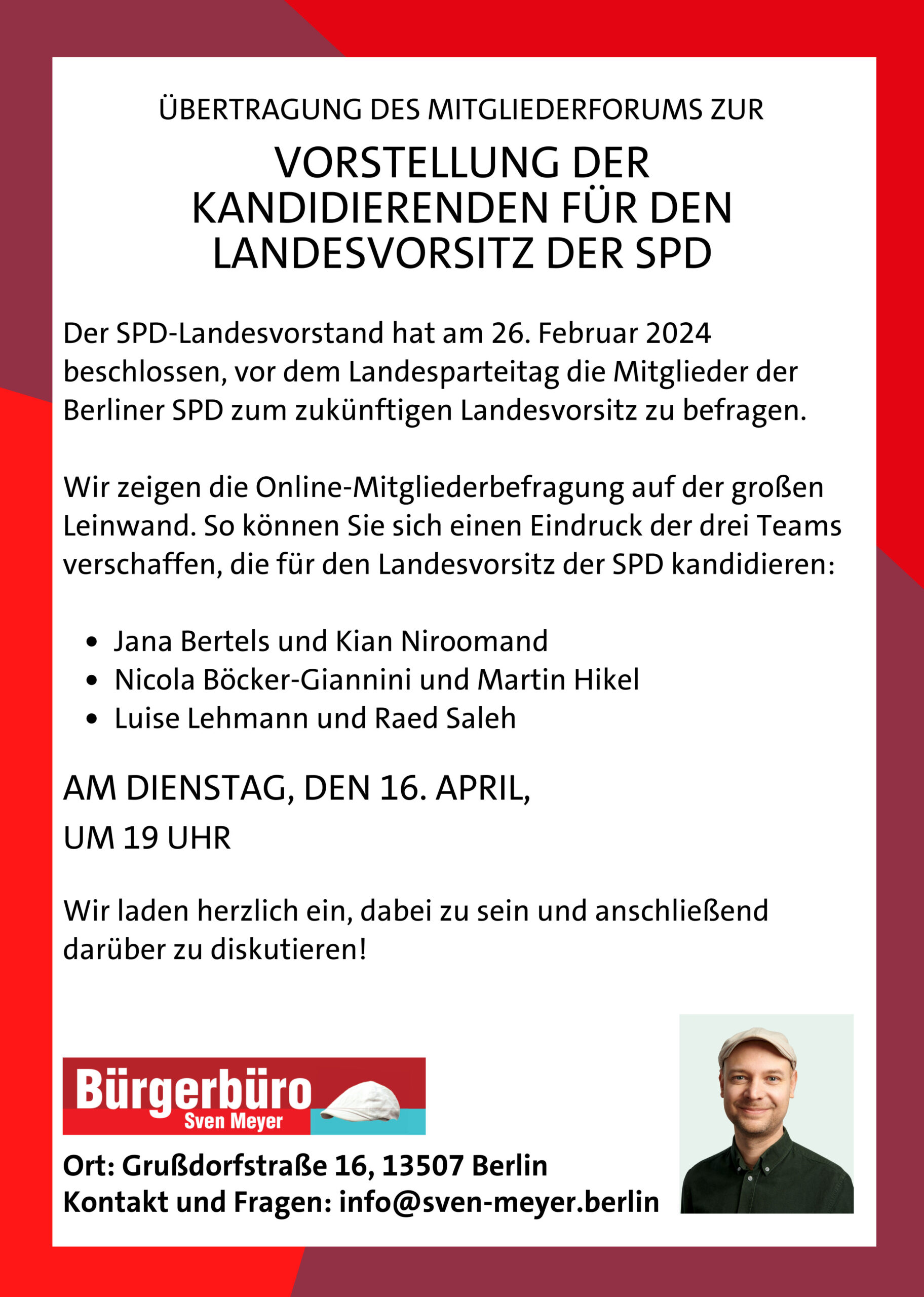 Bürgerbüro-Kino mal anders: Übertragung des Mitgliederforums von admin · Veröffentlicht 10. April 2024 · Aktualisiert 10. April 2024 Zur Vorstellung er Kandidierenden für den Landesvorsitz der SPD Dienstag, 16.April 2024, 19 UhrBürgerbüro Sven Meyer MdAGrußdorfstr. 16, 13507 Berlin-Tegel